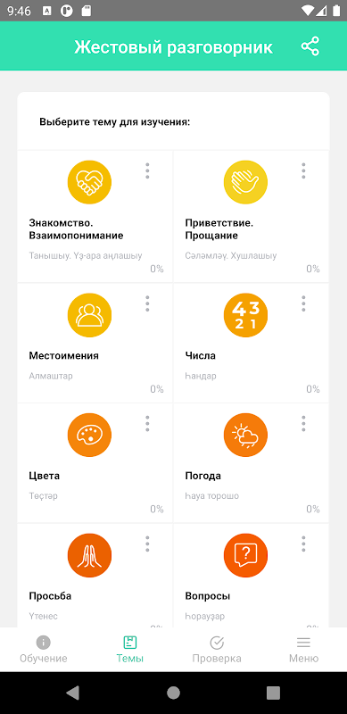 les situations de vie et les sphères des relations sociales. L'application contient plus de 500 structures conversationnelles de base en langue des signes bachkir. Chaque sujet est présenté avec une vidéo