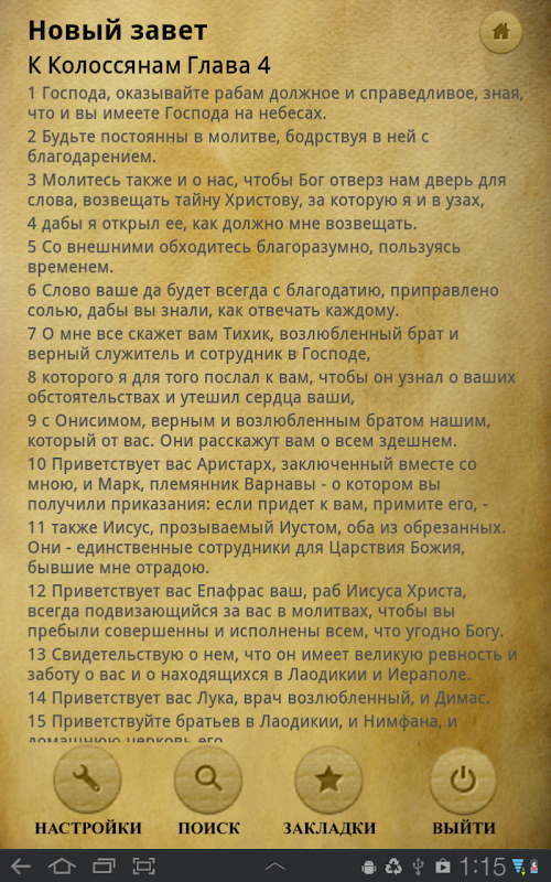 В нашем приложении вы найдете синодальный перевод книг Ветхого и Нового Завета Священного Писания. Перевод был осуществлён в течение XIX века и авторизован Святейшим Правительствующим Синодом.