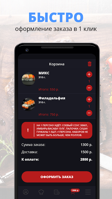 Nous préparons depuis de nombreuses années de gros et délicieux sushis et petits pains. Nous connaissons notre métier et l’aimons énormément. Vous pouvez vous asseoir dans nos cafés et également commander une livraison dans tout Moscou. Rejoignez les fans de gros rouleaux !
