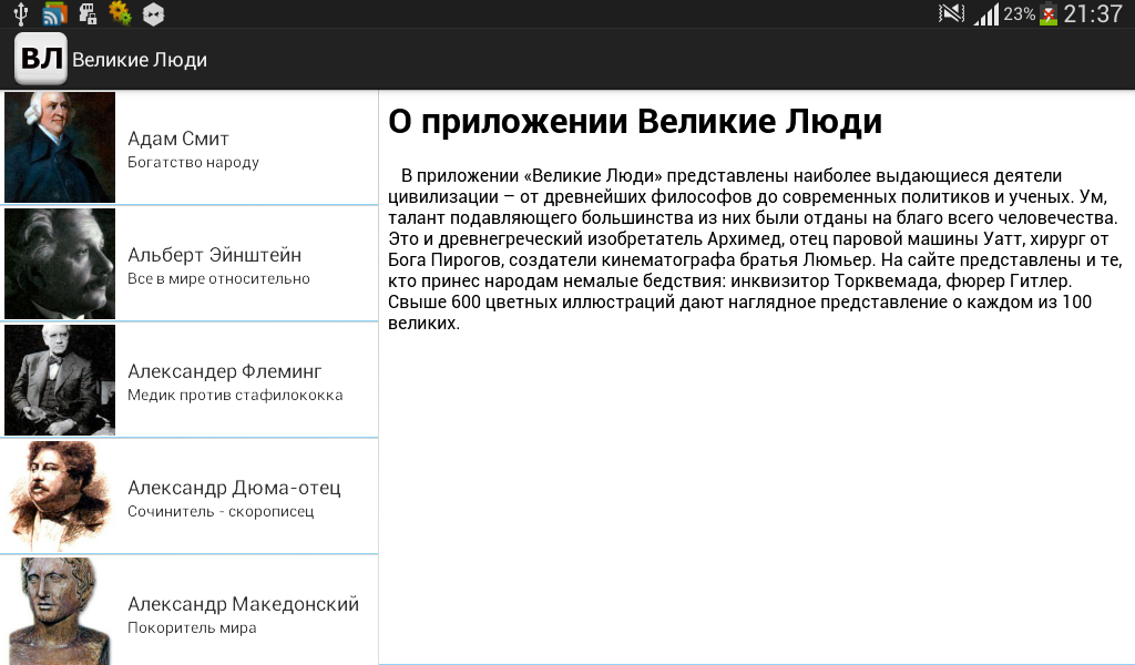 Annexe "Great People" présente les chiffres les plus remarquables de la civilisation - des philosophes antiques aux politiciens et scientifiques modernes. L'esprit, le talent de l'écrasante majorité d'entre eux ont été mis au bénéfice de l'humanité. Cette ancienne inventeur grec Archimède, le père de la machine à vapeur, Watt, un chirurgien de Dieu Pirogov, les créateurs du cinéma des frères Lumière. La demande soumise et ceux qui ont apporté les peuples de détresse considérable: Inquisiteur Torquemada, le Führer Hitler. Plus de 600 illustrations en couleur fournissent une représentation visuelle de chacun des 100 plus grands.