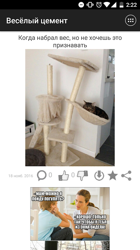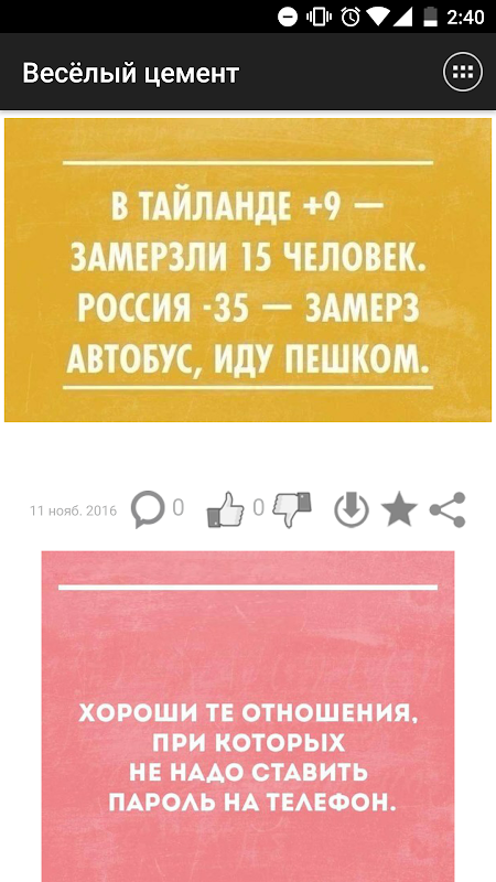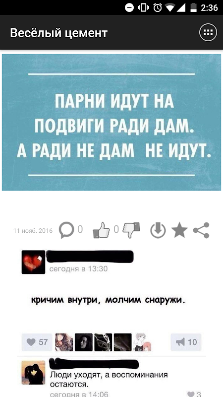 Понравившиеся записи можно комментировать и оценивать. Все понравившиеся картинки можно сохранять в галерее устройства в папке приложения. Ты можешь делиться записями с друзьями через социальные сети Facebook, Вконтакте, Одноклассники, Viber, WhatsApp а так же другие установленные на устройстве приложения. Ну и конечно, ты можешь оставлять лайки и сохранять записи в избранное.
