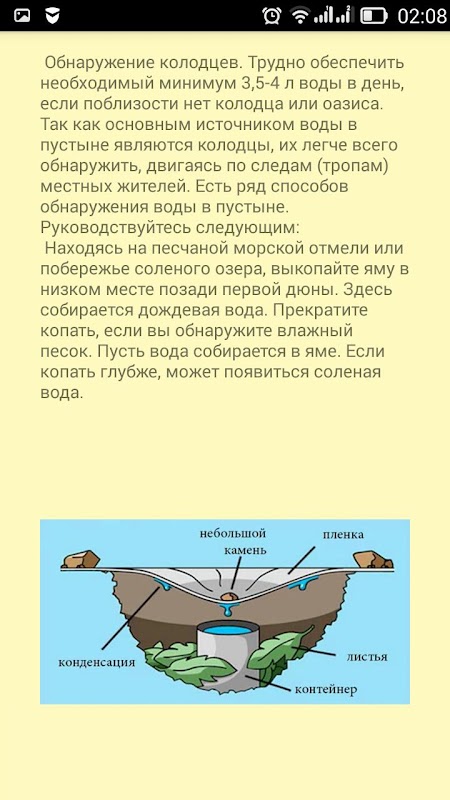 Il contient des informations sur la survie dans une variété de types de médias - des latitudes froides de l'Arctique dans le désert aride, des fourrés de la jungle à la haute montagne. Aussi, il ya des sections consacrées à la préparation de la campagne, les premiers soins à l'état sauvage, d'émettre les signaux de détresse orientation du terrain et de la psychologie de la survie.
