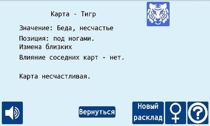 При трактовании расклада нужно учитывать все факторы - значение, положение, расстояние от главной карты, а также влияние соседних карт. Нажав на интересующую карту, можно получить расшифровку всех текущих показателей карты.