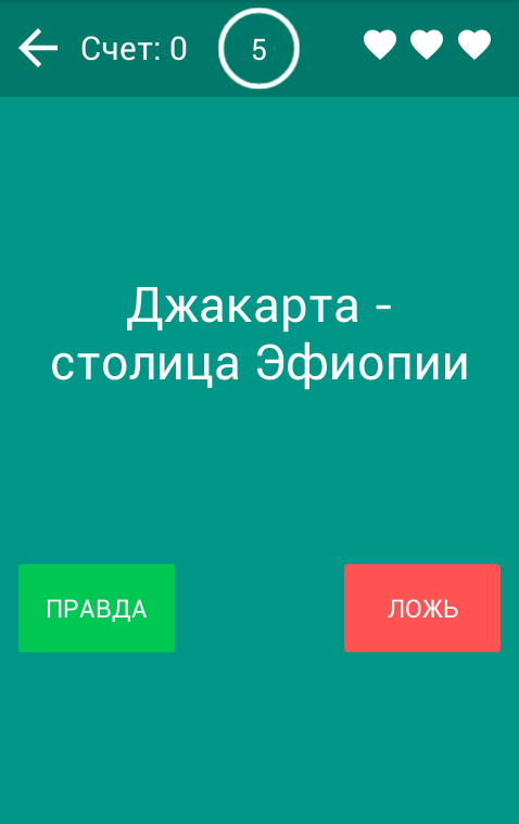 На каждый вопрос даётся 10 секунд и всего два варианта ответа: "ПРАВДА" или "ЛОЖЬ". Ответить неправильно можно только 3 раза за игру. Устанавливайте рекорды и соревнуйтесь с друзьями! Приятной игры!