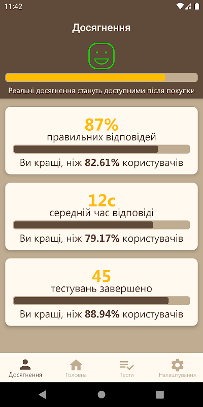 Dans cette application, vous pouvez non seulement étudier le matériel et passer des tests, mais également voir une comparaison de vos résultats avec les résultats d'autres utilisateurs en cours de test.