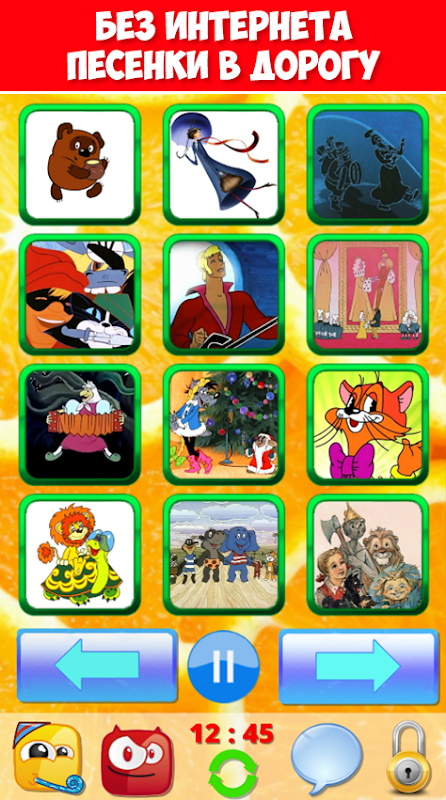 Chansons pour enfants et tout-petits - gratuites et sans Internet ! Large sélection de chansons pour enfants tirées de dessins animés soviétiques. Ils sont remplis de la gentillesse et des soins de cette époque. On dirait un téléphone pour enfants, les boutons sont des images de chansons