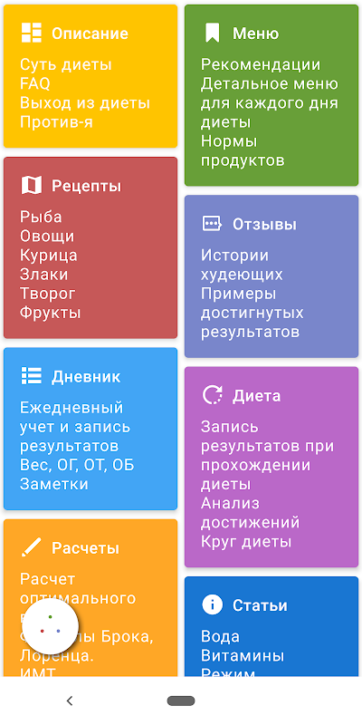Vous trouverez un outil indispensable dans le visage de l'application, car elle a rassemblé les informations les plus pertinentes pour chacun des jours de la diète. Cette description des principes généraux et des exemples de réalisation de menus et de recettes et beaucoup d'autres informations utiles pour tous les jours, qui est capté fortement afin que vous pouvez obtenir les résultats souhaités!