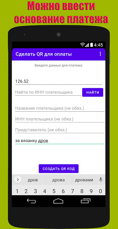 Créez des codes QR pour le paiement de vos clients si vous avez un entrepreneur individuel ou une LLC. Envoyez des codes QR dans l'un des messagers ou affichez-les simplement sur l'écran du téléphone.