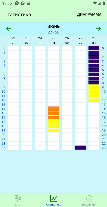 - Смотреть на изменения времени сна, с помощью диаграммы и графика