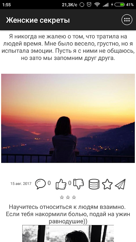 Понравившиеся записи можно комментировать и оценивать. Все понравившиеся картинки можно сохранять в галерее устройства в папке приложения. Ты можешь делиться записями с друзьями через социальные сети Facebook, Вконтакте, Одноклассники, Viber, WhatsApp а так же другие установленные на устройстве приложения. Ну и конечно, ты можешь оставлять лайки и сохранять записи в избранное.