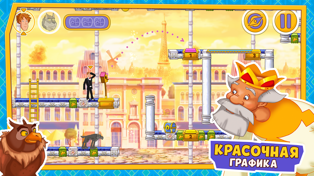 - 60 уровней игры разворачиваются в антуражах Тридевятого царства, Парижа, замка Кощея