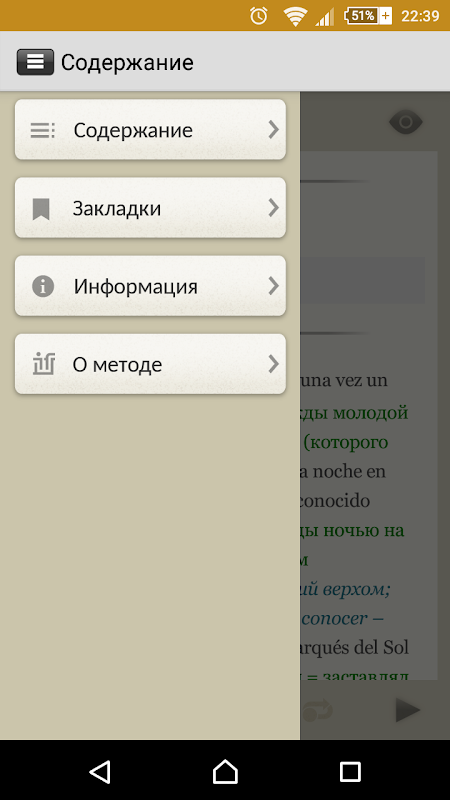 Приложение способствует эффективному освоению испанского языка, может служить дополнением к учебной программе. Предназначено для студентов, для изучающих испанский язык самостоятельно, а также для всех интересующихся испанской культурой. Одновременно с чтением текста, вы можете прослушивать звуковой трек или просто использовать приложение как аудиокнигу.