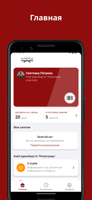 Application mobile pour les clients du club d'arts martiaux "Petrograd"