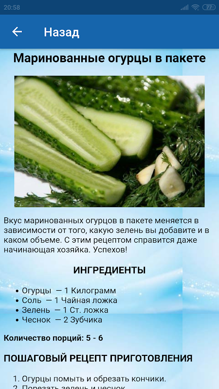 Наши рецепты с фото консервированных огурцов не содержат каких-то экзотических ингредиентов, поэтому любой сможет с легкостью их повторить в домашних условиях. В нашем приложении вы найдете множество рецептов заготовки огурцов на любой вкус. Также вы научитесь готовить малосольные огурцы, которые будут готовы к употреблению уже через несколько дней.