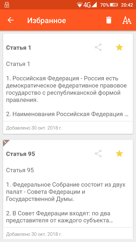 - Affichage du texte de la constitution sous la forme d'une rotation de page pratique des articles, possibilité de copier le fragment sélectionné, recherche par texte