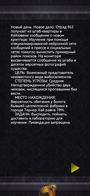 « Cryptostalker » est une fiction interactive. Il s'agit d'une aventure textuelle dans le genre action. Devenez un chasseur de cryptides et lancez-vous dans l'aventure la plus dangereuse à ce jour.