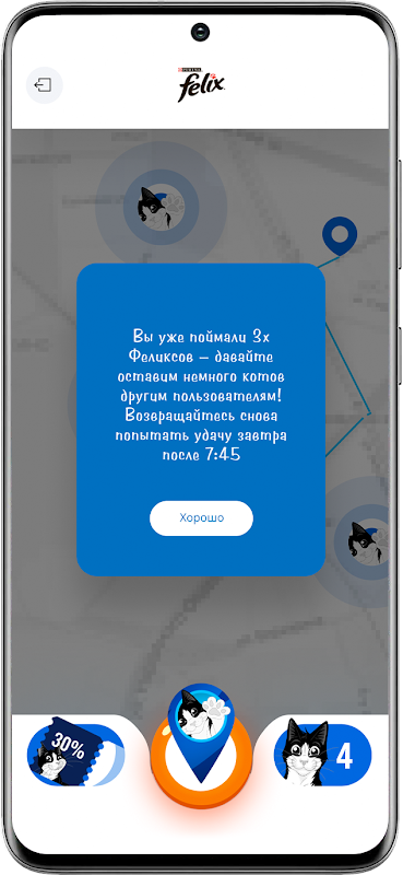 Inscrivez-vous dans notre application et obtenez l'opportunité d'attraper le malicieux Felix dans les rues de votre ville tous les jours. Échangez les chats capturés contre des codes promotionnels, et du 21 avril au 30 juin 2021, bénéficiez de remises de 10 à 30% sur les produits Felix® dans les magasins Magnit.