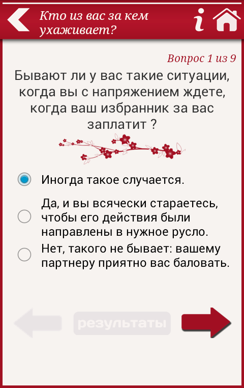 Не упустите возможность скачать уникальный и наиболее полный сборник тестов о любви. Наши тесты помогут вам узнать насколько вы очаровательны и привлекательны для мужчин. Вы сможете лучше понять ваши отношения с вашей половинкой, узнаете предан ли ваш мужчина вам, любит ли он вас. Наше приложение поможет вам разобраться хорошо ли вы понимаете друг друга, насколько вы хорошая пара, подходит ли ваш мужчина на роль вашего мужа и многое другое.