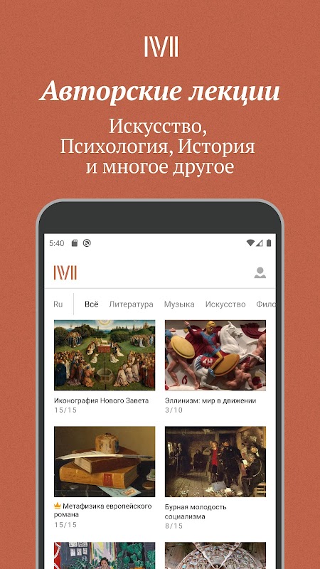 Cours magistraux en littérature, musique, art, philosophie, religion, histoire, psychologie et autres disciplines. Connaissance approfondie des meilleurs enseignants et praticiens. Compétences utiles pour la vie et la communication. Enregistrements audio et transcriptions de conférences, illustrations, recommandations pour une lecture indépendante.