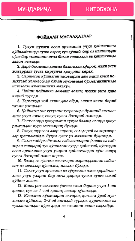 Мазкур тўпламга кирган бутербродлар, салатлар, ичидеиздар^иссиқтаомлар рецептлари дунё ошхонаси таом&омасидан саралаб олинди. Китоб қўли ширин, пазанда бекалар, шунингдек, эндигина ошхонада таом тайёрлаш сцрларици ўрганаётган қизларимиз эътибо- рига ҳавола этилади.