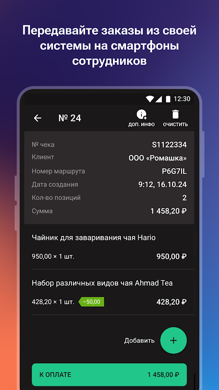 3. Associez votre smartphone à la caisse enregistreuse en suivant les instructions (https://support.evotor.ru/article/7477419124498). Les données relatives à vos produits apparaîtront sur vos smartphones ; vous pouvez commencer à vendre.