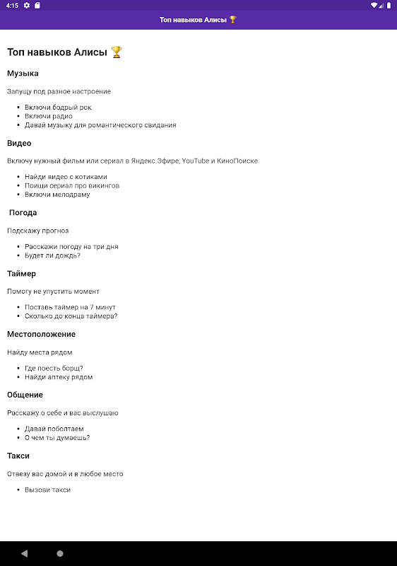 Alice Алиса (Alisa) Commandes vocales que vous pouvez essayer. Vous pouvez utiliser les commandes incluses dans cette application pour lire de la musique, des vidéos, obtenir des mises à jour météorologiques et bien d'autres dans l'assistant virtuel Yandex.