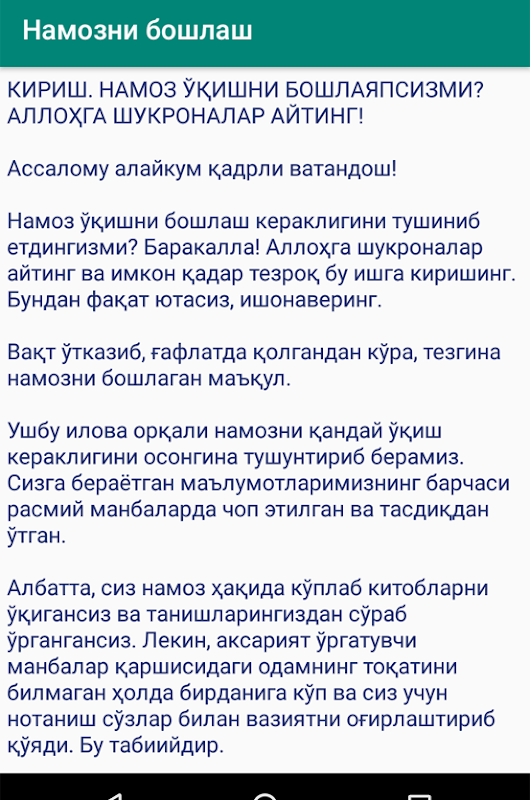Islom dini ustuni bo'lgan namozni boshlash dasturi. Namoz kitobi