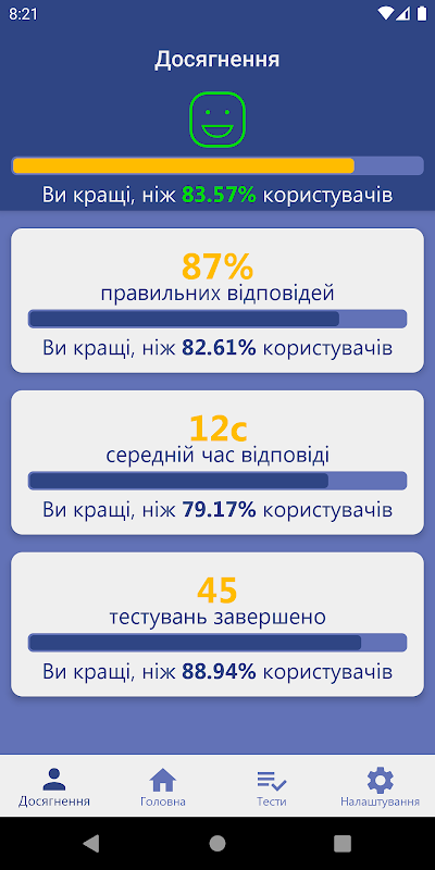Dans cette application, vous pouvez non seulement étudier le matériel et passer des tests, mais également voir une comparaison de vos résultats avec les résultats d'autres utilisateurs en cours de test.