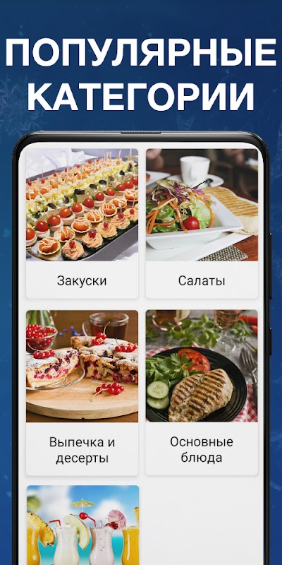 Les recettes du Nouvel An dans notre application sont divisées en catégories pour une recherche facile. Vous avez besoin de préparer un repas chaud ou un apéritif ? Aucun problème! En utilisant la fonction de recherche, vous pouvez trouver rapidement les recettes dont vous avez besoin pour le Nouvel An et créer un menu pour la table de fête.
