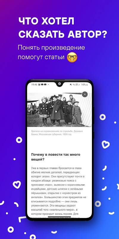 Les œuvres de l'application accompagnent des articles et des histoires. Dans ces documents, des experts de la Bibliothèque d'État de Russie parlent dans un langage simple et accessible des œuvres, de l'intention de l'auteur et donnent des recommandations aux lecteurs.