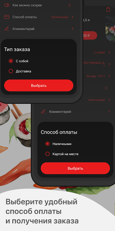 Comment passer une commande dans l'application « Okinawa » : sélectionnez les articles qui vous plaisent dans le menu, ajoutez-les à votre panier et accédez à l'écran de paiement (en cliquant sur l'icône du panier).