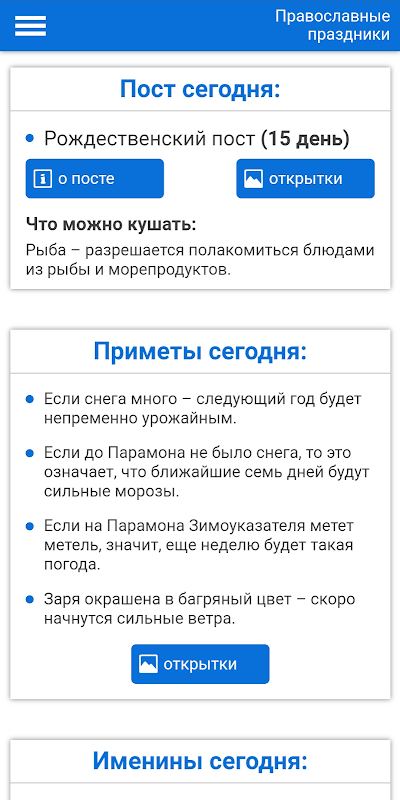 Une application absolument gratuite avec des cartes postales, des vacances orthodoxes (à l'église), le jeûne, des jours de nom et des signes, vous aidera à toujours vous tenir au courant des événements orthodoxes, ainsi que de féliciter vos proches et amis avec des cartes postales. Plus besoin de chercher, demandez à quelqu'un quand telle ou telle fête aura lieu. Nous l'avons fait pour vous. Un calendrier pratique de toutes les vacances orthodoxes vous informera des vacances à venir et vous pourrez également vous rafraîchir la mémoire de sa signification. Les grandes fêtes orthodoxes sont mises en évidence séparément. Vous serez en mesure de vous préparer à l'avance à des événements particulièrement importants du peuple chrétien. Vous saurez quand le jeûne commence et se termine. En plus des signes folkloriques, ce qu'ils portent en eux-mêmes et à quoi s'attendre.