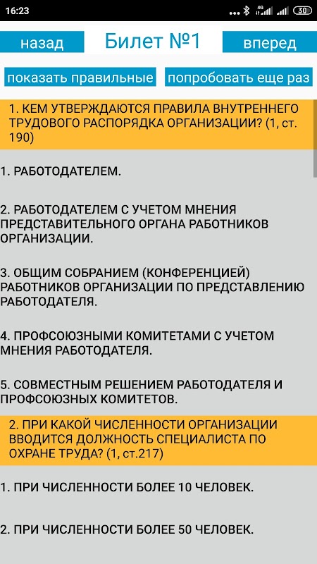 Удобная навигация по билетам, вверху приложения. Всего за один вечер, почитав вопросы и потыкав в экран телефона можно хорошо подготовиться к экзамену по "Охране труда".