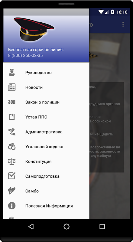 Version complète et abrégée du Code criminel (Code criminel), version complète et abrégée du Code des infractions administratives (CAO), la Constitution, la Loi sur la police, la police Executives Charte PPP, des uniformes de police, Test SMIL "Makarov", contacts utiles des exemples de rapports (en vacances, licenciement), des ordonnances et des tests d'auto-étude. Nouvelles MIA.