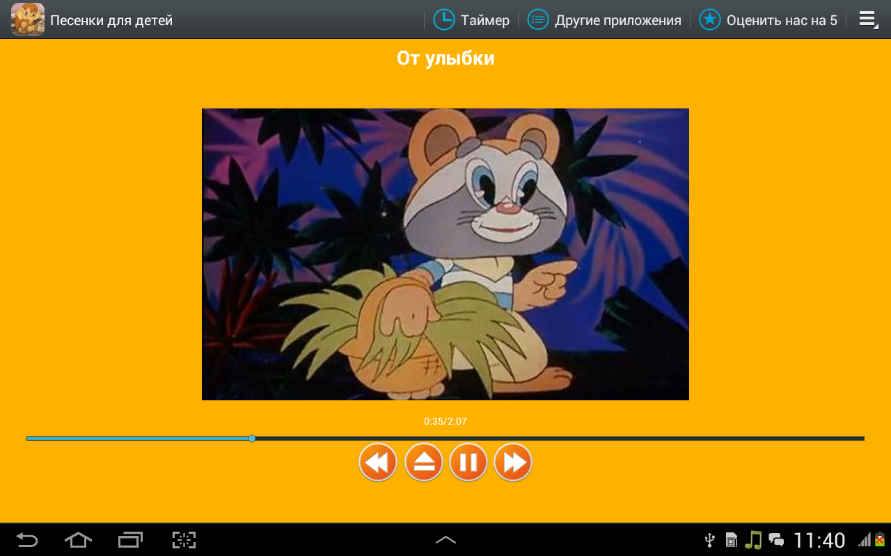 L'application contient des chansons telles que "Dans une boîte avec des crayons", une chanson d'un brillant détective du film "Musiciens de Brême", Chanson d'une fille gigantesque et Jouets fatigués endormis (berceuse).