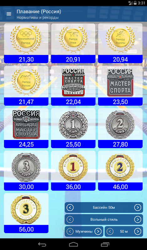 Tous les grades et toutes les classes de natation sont divisés en styles et distances de natation. Les données sont données non seulement pour les piscines, mais aussi pour les "eaux libres".