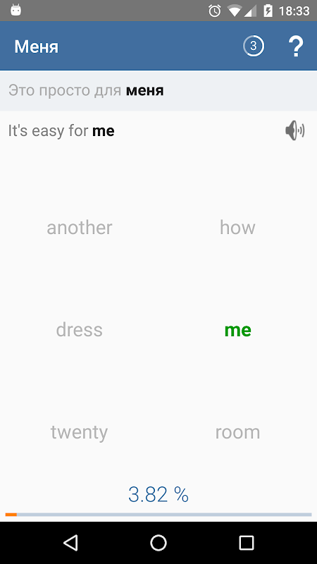 Le programme offre en parole russe et phrase avec le mot. Vous devez répondre à la façon dont ce mot dans ce contexte doit être traduit en anglais.