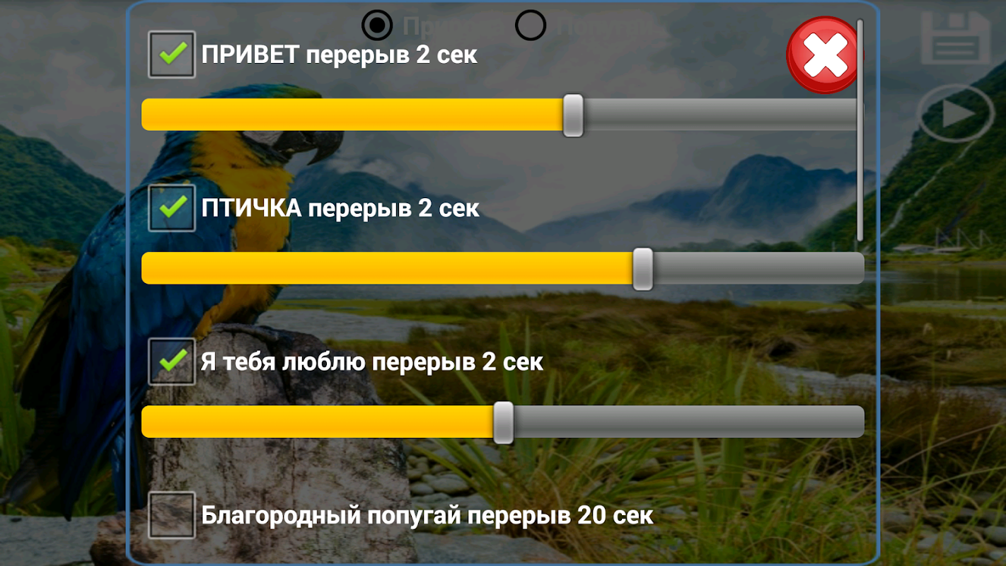Слова повторяются с интервалом в 2 секунды для 4 видов птиц таких как :