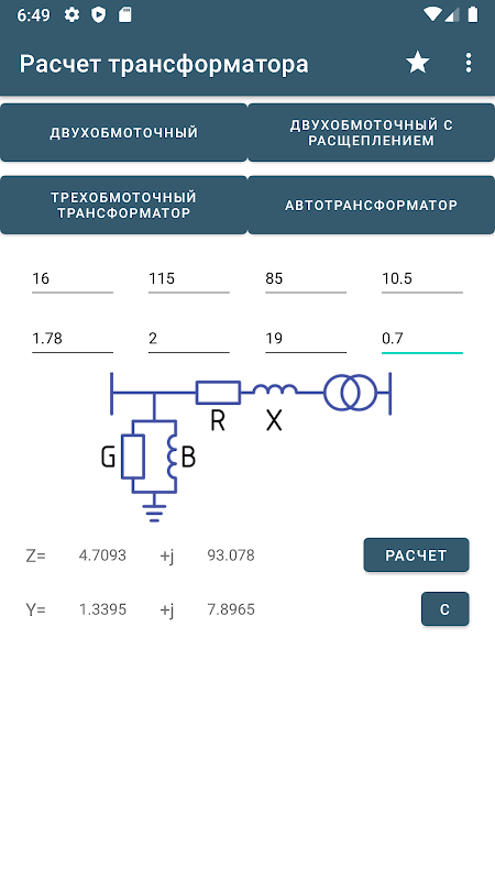 В приложении «Расчет трансформатора» осуществляется расчет элементов схем замещения силовых трансформаторов. Рассчитываются активное и индуктивное сопротивление, а также активная и индуктивная проводимости.