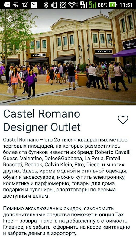Chaque objet de la demande est accompagnée d'une photo, la description, le niveau approximatif des prix et des recommandations sur ce qu'il faut chercher. Après tout, Rome - un véritable musée en plein air, et les voyageurs donnent souvent les chefs-d'œuvre de renommée mondiale, tout simplement parce qu'ils sont cachés derrière les façades des bâtiments est assez médiocre.