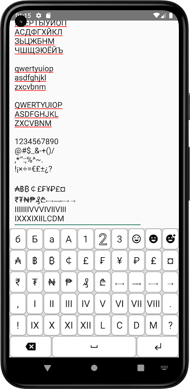 L'application comprend un total de 10 couches différentes : inférieur russe, supérieur russe, inférieur anglais, supérieur anglais, chiffres et 3 symboles communs, 3 émoticônes.