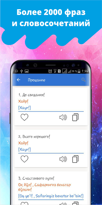 Русско- узбекский разговорник (узбекско-русский разговорник - русча узбекча сузлашгич) содержит более 3000 фраз, которые отсортированы и сгруппированы по темам с изображениями. Самое главное Русско- узбекский разговорник (узбекско-русский разговорник - русча узбекча сузлашгич) произношение фразы на русском языке, это функция позволяет изучать русский язык с правильным произношением.