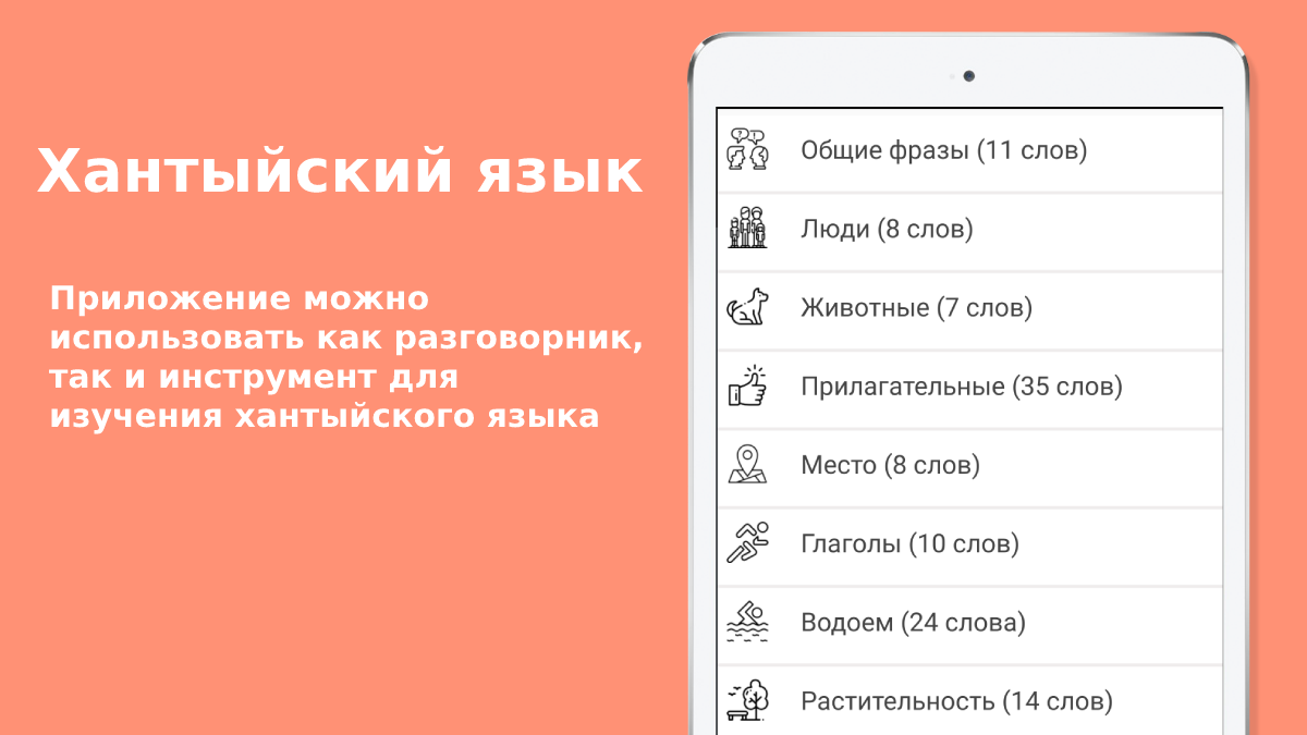 Русско-хантыйский разговорник можно использовать соответственно, как разговорник, так и инструмент для изучения хантыйского языка. Все хантыйские слова написаны русскими буквами и разбиты на 10 логических тем, то есть разговорник рассчитан на русскоговорящего пользователя (туриста).