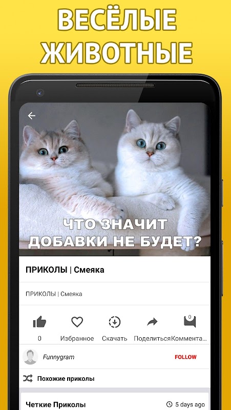 Делитесь наиболее понравившимися приколами вместе с друзьями через соцсети или мессенджеры. Если какой-либо пост понравился – ставьте лайки и оставляйте комментарии. Просто нажав на соответственную кнопку телефона, любая фотография, пост или анимация мгновенно скачается.