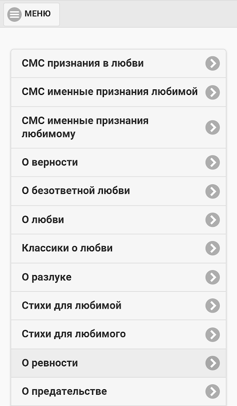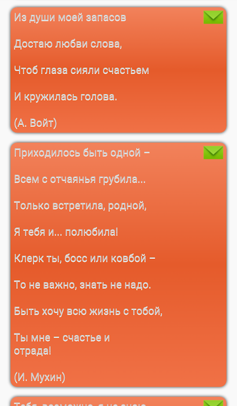 Стихи о любви красивые и трогательные стихотворения о любви классиков и современных поэтов. Стихи о любви это песня влюбленной души, парящей на крыльях любви. Романтичная и влюбленная девушка может рассказать о своих чувствах, любимому парню. А если ты парень, то сможешь оригинально поведать о своих чувствах в стихах любимой девушке. Вы сможете посмотреть какими разными бывают стихи о любви, как и сама любовь, найдете стихи о грустной и о счастливой любви, стихи про печальную и про красивую любовь и многое другое. Найдя подходящий стих о любви, вы сможете отправить его любимому человеку прямо из приложения.