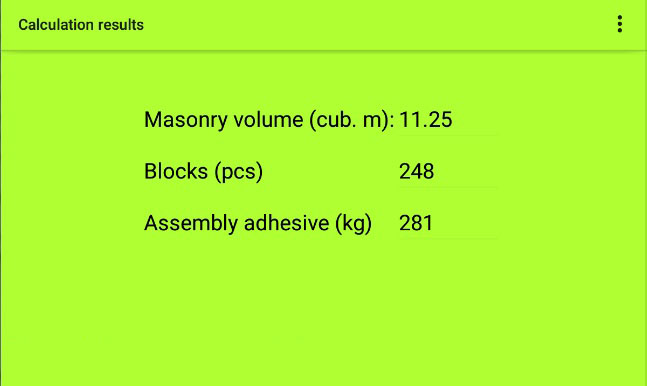 Cette application calcule les matériaux de construction pour la maçonnerie d'une maison, d'un chalet, d'un bain public, d'un garage et de toute autre structure qui, en plan, forme un quadrilatère avec des côtés opposés identiques (carré, rectangle, parallélogramme ou losange). Ceci est disponible sur la page principale de l'application.