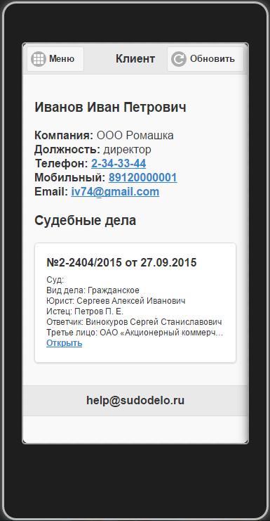 Интеграция с сайтами судебных органов, автоматическое оповещение о событиях по судебным делам.