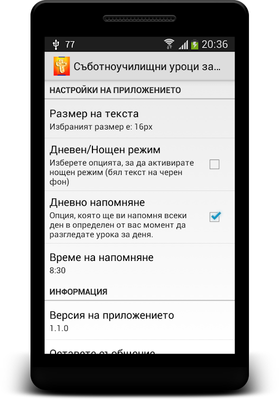 «leçons Sabotnouchilishtni pour les adolescents" est un guide mobile étude de la Bible pour les adolescents - 12 à 16 ans. Il apprendra plus sur la foi chrétienne et Jésus-Christ - le Sauveur de l'humanité. La direction ne utilise pas paquet de données et vous serez en mesure de voir les leçons même sans connexion internet.
