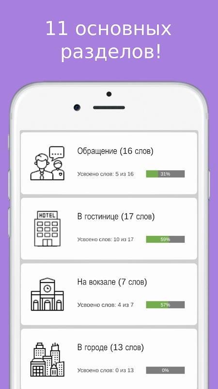 L'application vous permettra de faire le premier pas vers l'apprentissage de la langue à partir de zéro, de vous intéresser, et ensuite c'est à vous de décider si vous souhaitez vous limiter uniquement aux phrases familières en russe, ou aller plus loin, en étudiant la grammaire, le vocabulaire et la syntaxe. .