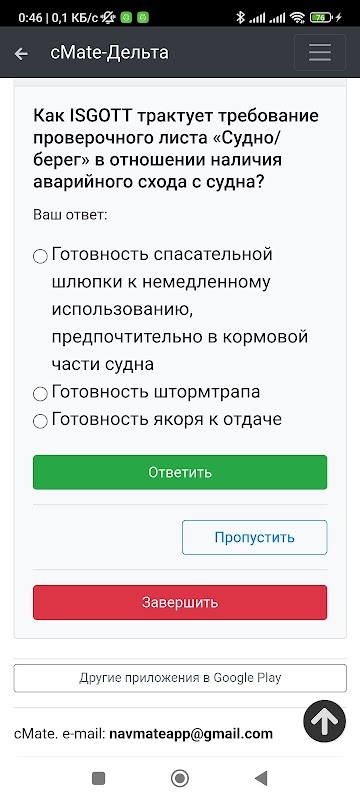 L'application est conçue pour tester les connaissances des membres d'équipage des navires. Spécialistes dans la réalisation d'opérations de fret sur pétroliers et chimiquiers. Formation initiale